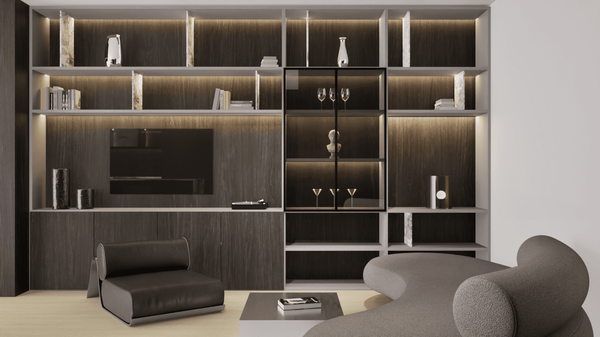 Located in Park Lake, Cluj-Napoca, this apartment was designed in 2026. It features a simple style with dark wood cabinets and a marble kitchen island. The open layout and built-in shelving create a clean and functional living space.
